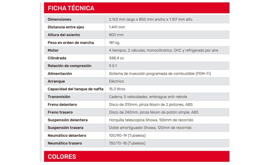 La Honda CB350 H´ness incorpora un motor monocilíndrico de 349 cc, que se caracteriza por entregar un torque pleno desde bajas revoluciones, lo que permite una conducción suave, ágil y con muy buena respuesta, tanto en ciudad como en ruta. El conjunto se complementa con inyección electrónica, refrigeración por aire y una caja de transmisión de cinco cambios con embrague asistido y anti-rebote, que mejora el control y la comodidad al cambiar de marcha.