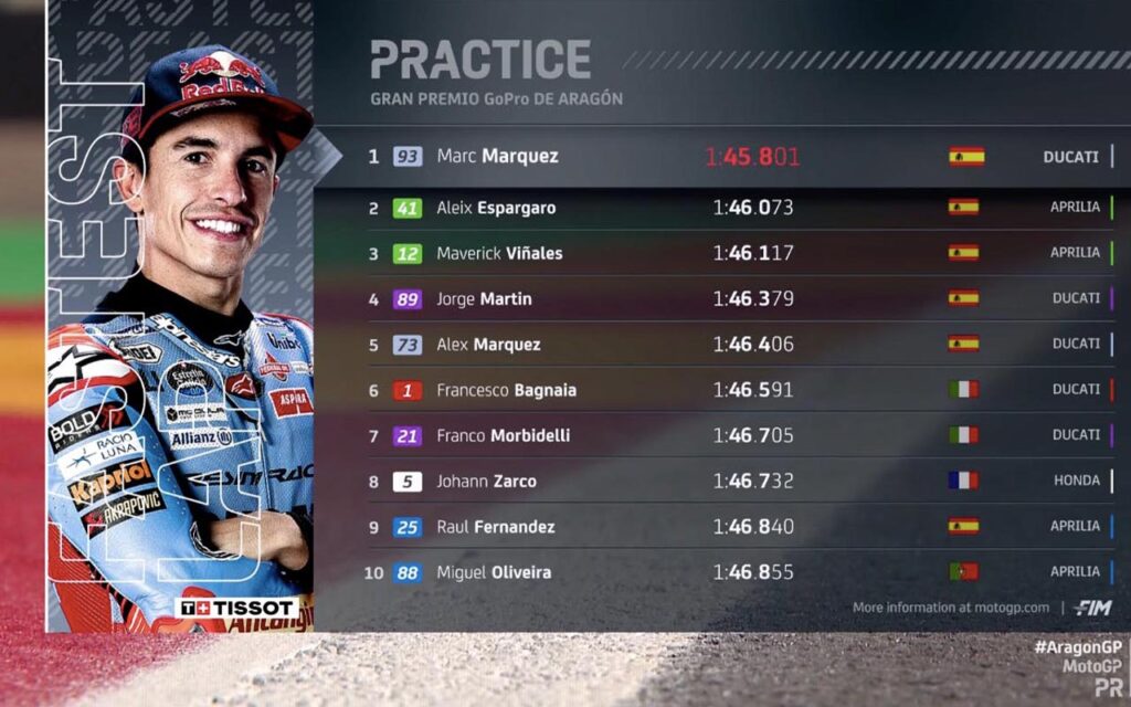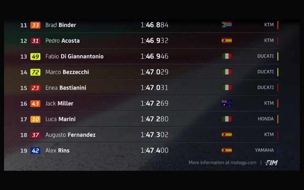 De esta manera, los diez pilotos que pasan directo a la Q2 clasificatoria son los que figuran en la pantalla 1 de la tabla de tiempos: Marc Márquez (Ducati), Aleix Espargaró y Maverick Viñales (Aprilia), Jorge Martín, Alex Márquez, Francesco Bagnaia y Franco Morbidelli (Ducati), Johann Zarco (Honda), Raúl Fernández y Miguel Oliveira (Aprilia).