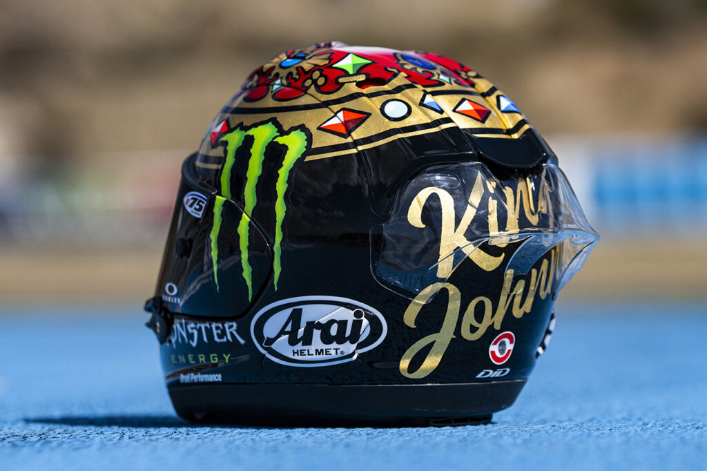 Sobre una base en negro satinado y con detalles en oro de 24 quilates, este diseño exclusivo luce los números romanos ‘VI’, que representan sus títulos; el número dorado ’65’, la inscripción ‘King Johnny’ y un motivo de ‘joyas de la corona’, confiriendo así un exquisito tributo a una leyenda insuperable del Campeonato del Mundo de Superbike.