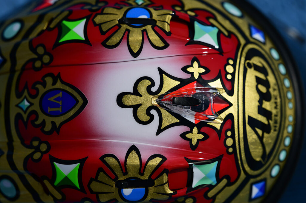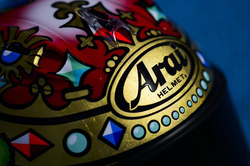 Por ello, Arai Helmet presentó en la cita de España un casco único y especial, obra de Aldo Drudi, de Drudi Performance, colaborador habitual de la marca.