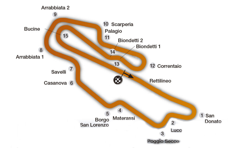 El trazado tiene una longitud de 5.245 metros, con un rectilíneo principal que mide 1.141 metros, una cinta asfáltica de 14 metros de ancho y 15 curvas, seis a la izquierda y nueve a la derecha. Según una medición especial, el recorrido reparte rectas y curvas casi en un 50%, ya que tiene tramos derechos en 2.699 metros y sectores con virajes en 2.545 metros. Los lugares más importantes a tener en cuenta son la larga recta que lleva a la frenada de San Donato (donde la succión con otro piloto es fundamental para ganar tiempo); así como la ‘bajada’ en las curvas con contraperalte de Casanova y Sabelli o las dos curvas Arrabbiata (Uno e Due) que son necesarias encadenar de una manera veloz para obtener un buen registro.