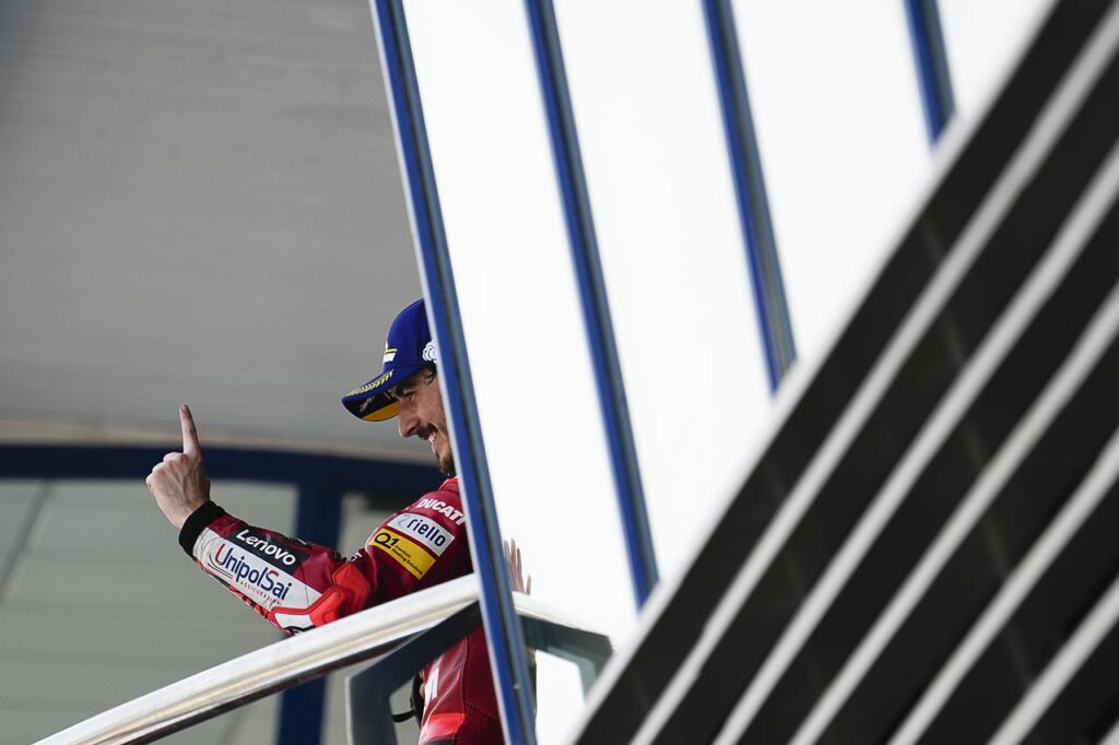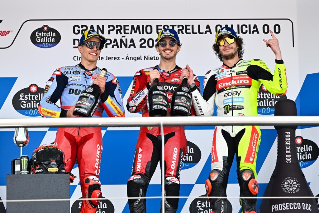 Podio: 1° Pecco Bagnaia (Ducati), 2° Marc Márquez (Ducati), 3° Marco Bezzecchi (Ducati)