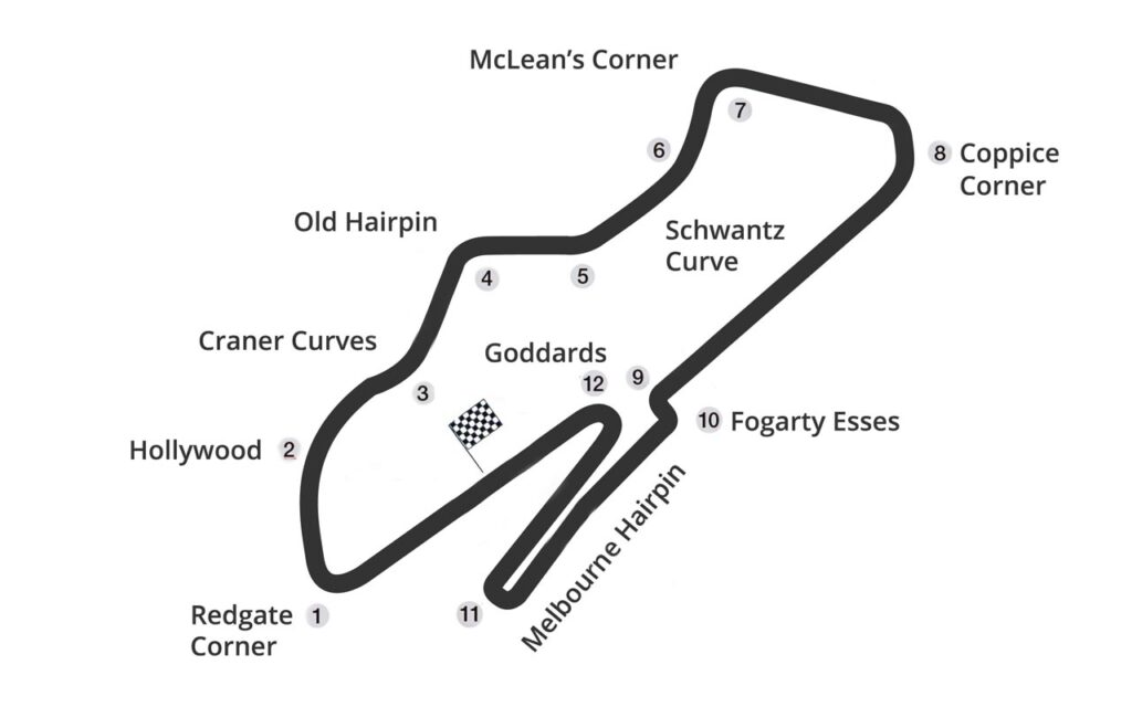 El trazado actual tiene una extensión de 4.023 metros. Su recta más larga mide 564 metros. Cuenta con 12 curvas, 7 a la derecha y 5 a la izquierda. La pista tiene un ancho de 10 metros y, pese a no ser muy amplia, tiene características que facilitan el sobrepaso en varios sectores clave. Su dibujo presenta dos zonas diferenciadas: una parte fluida y veloz (Hollywood, Craner Curves, Old Hairpin) y otra bastante más lenta (Fogarty Esses y Melbourne).