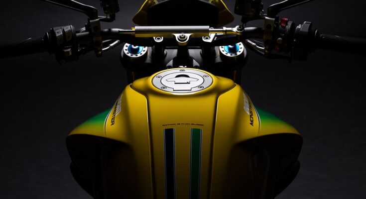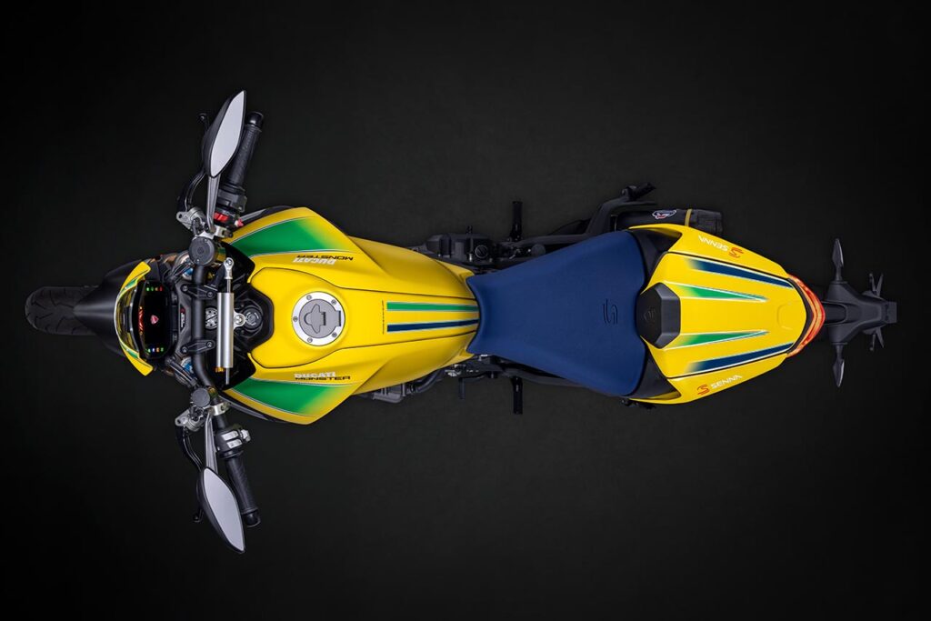 La edición especial de Monster Senna es para celebrar la sólida relación establecida entre la marca de Borgo Panigale y el campeón brasileño y la colaboración dio lugar a un diseño de esquema de color especial, diseñado por el Centro Stile Ducati, inspirado en el color del casco que Ayrton usó en las carreras a lo largo de su campaña deportiva (alternando tonos amarillos, verdes y azules en homenaje a la bandera de Brasil).