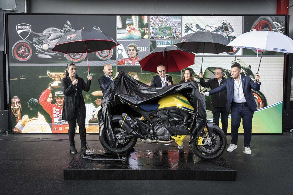 Una Ducati Monster dedicada a Ayrton Senna fue presentada en el paddock del circuito Enzo y Dino Ferrari de Imola durante el Gran Premio de Fórmula 1 de Emilia-Romagna. Claudio Domenicali (CEO de Ducati) y Bianca Senna (CEO de Senna Brands) compartieron el vínculo entre Senna y Ducati, con la contribución también de Stefano Domenicali (Presidente y CEO de Fórmula 1).
