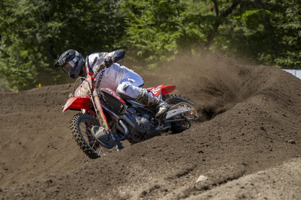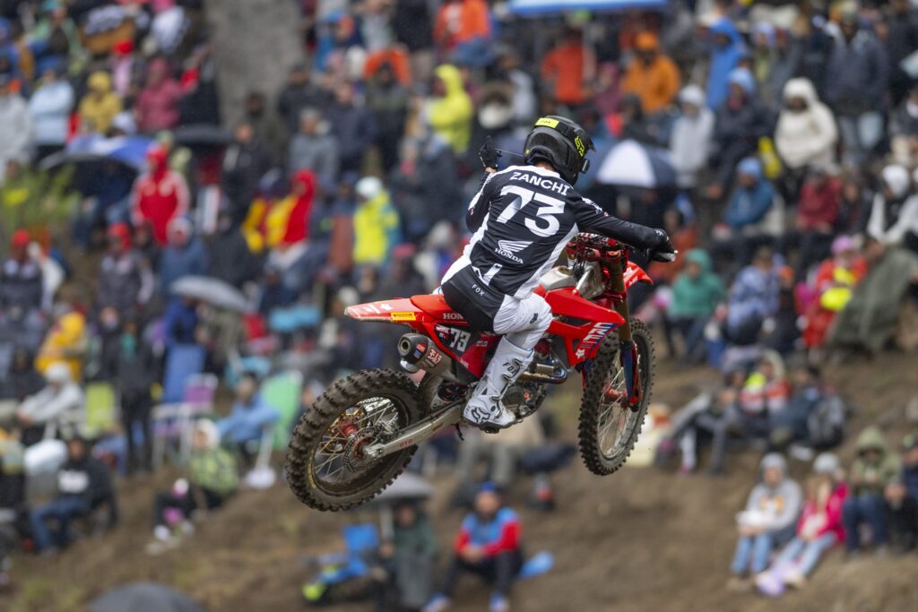 Ya en las competencias del domingo, una pequeña falla conductiva en los tramos iniciales de la primera carrera (Moto1) hizo retrogradar a Tim Gajser (#243) hasta el puesto 13. Desde allí, inició una furiosa recuperación que lo llevó al quinto lugar al momento del final.