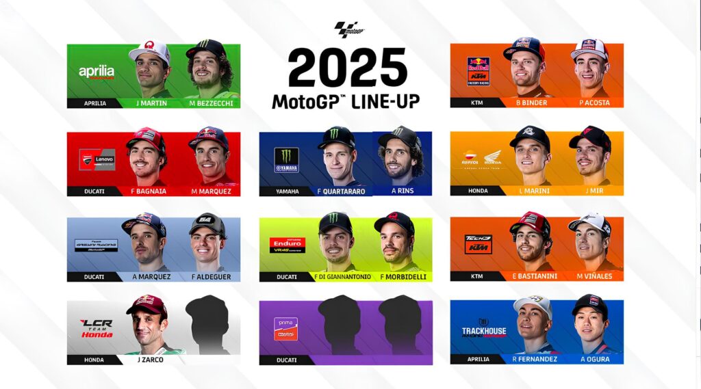 El tablero del elenco 2025 está casi completo. Quedan disponibles tres lugares, de los cuales uno es prácticamente una confirmación todavía no anunciada. Se trata de la segunda moto del equipo Honda LCR de Lucio Cecchinello, unidad que seguramente seguirá en manos del japonés Takaaki Nakagami ya que uno de los sponsors principales (Idemitsu Lubricants) prefiere seguir con pilotos que representen a la nación del Sol Naciente.
