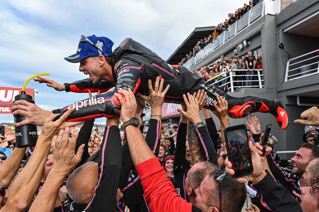 El piloto italiano cierra un año histórico, el más exitoso de Aprilia Racing en MotoGP, con cifras extraordinarias: 15 podios en total, con tres victorias en las ‘Sprint Races’ y tres en Grandes Premios, además de cinco poles. Esta combinación de resultados le permitieron asegurar el tercer puesto en el campeonato de pilotos y a Aprilia Racing el segundo en el campeonato de constructores.
