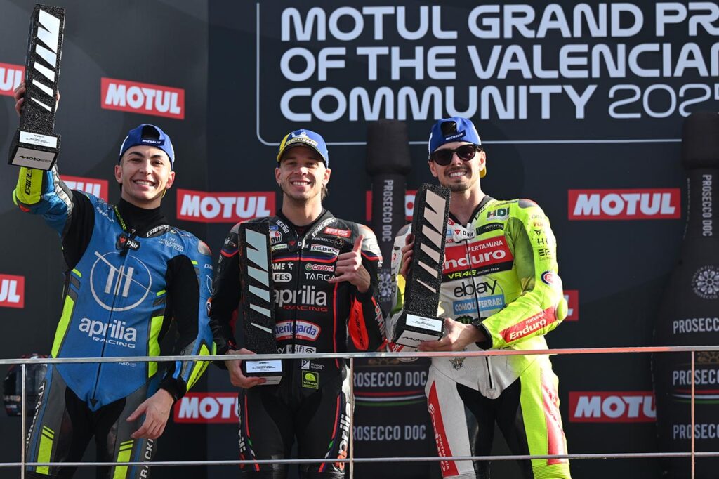 La temporada 2025 terminó de la mejor manera posible para el equipo Aprilia Racing. Marco Bezzecchi partió desde la pole y dominó durante las 30 vueltas para consiguiendo así su tercera victoria de la temporada, escoltado por otro piloto de la marca, el local Raúl Fernández quien, como en Australia, volvió a ser protagonista de la punta, y conformó así un magnífico doblete para las RS-GP25.