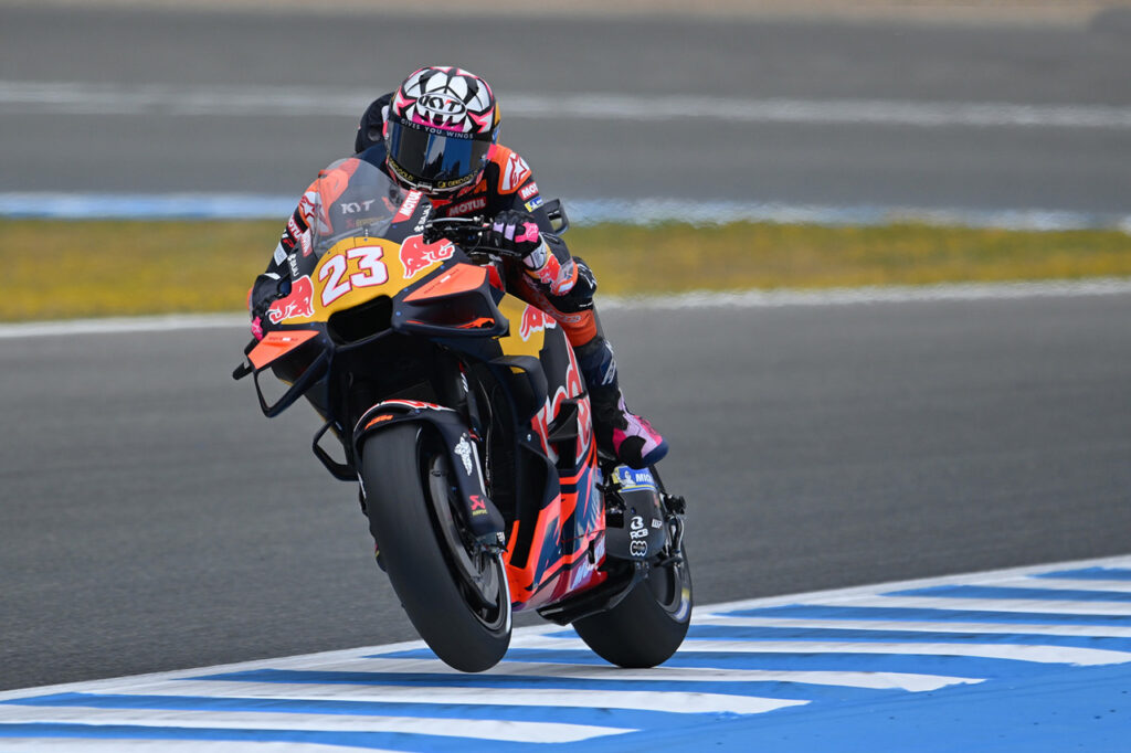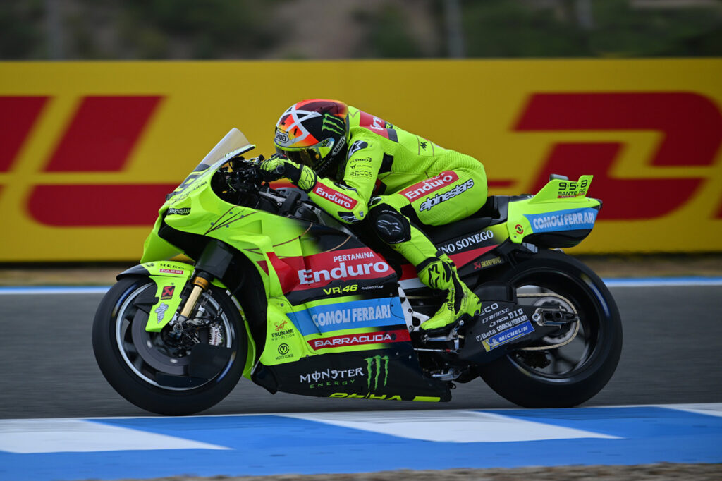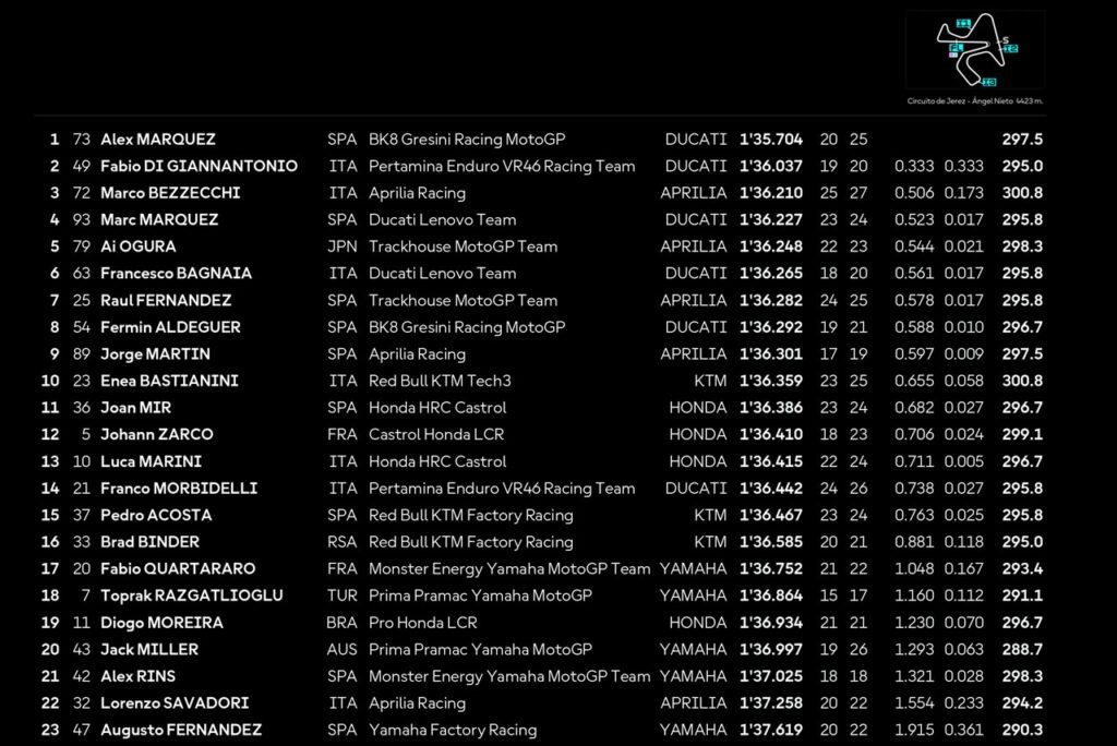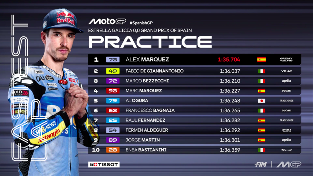 Ninguna suposición fue acertada (al menos en el viernes de entrenamientos), ya que si bien Ducati dominó ambas sesiones de ensayos lo hizo con pilotos que no estaban en los planes. Por la mañana, Fabio Di Giannantonio y Franco Morbidelli establecieron un 1-2 para el equipo de Valentino Rossi; mientras que por la tarde fue Alex Márquez (ganador en Jerez el año pasado) quien se quedó con el mejor tiempo por delante de ‘Diggia’ y el líder provisional Bezzecchi.