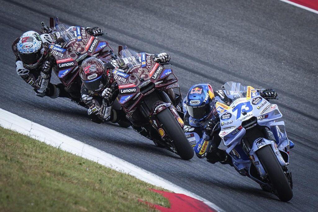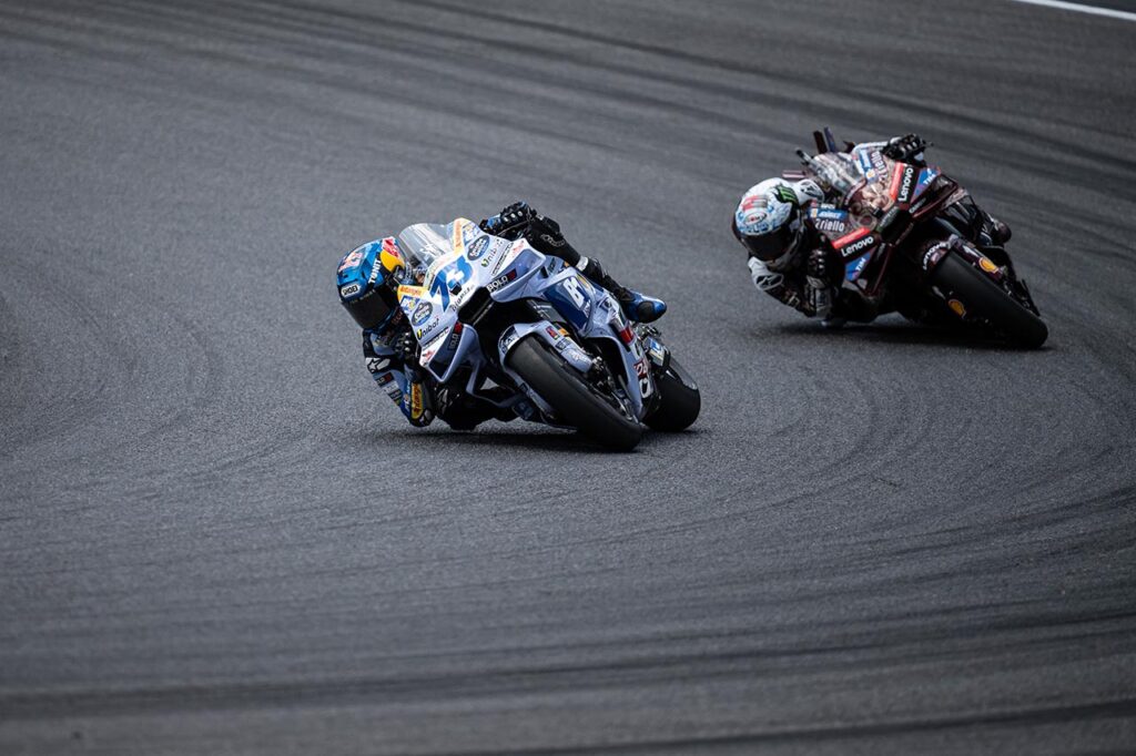Bagnaia, demostró estar un paso delante de lo que vino insinuando en las últimas presentaciones, con un ritmo superior y más cercano a la punta, pero una arriesgada maniobra que casi le quita la moto de las manos (en el transcurso de la quinta vuelta) le costó mantenerse en la vanguardia, debió aminorar su marcha y fue superado por Alex Márquez (Gresini Racing) y su hermano Marc. Más cerca del final, ya con unos neumáticos muy desgastados, fue aventajado por Fabio Di Giannantonio (VR46 Racing Team) y por lo tanto quedó cuarto, a los pies del tan ansiado podio.