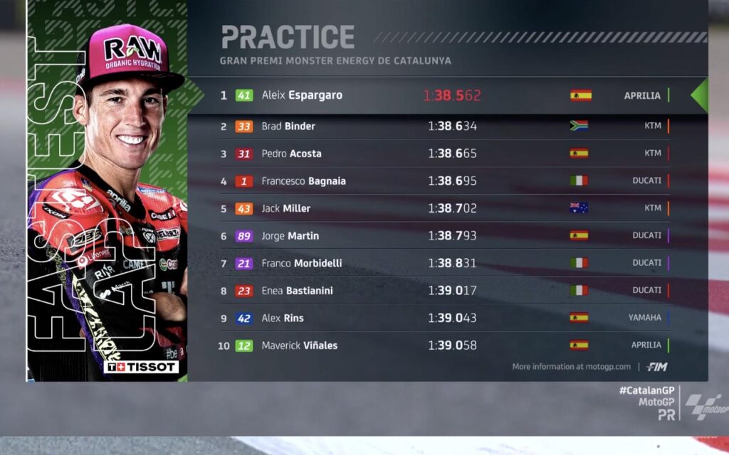 En los resultados, a 24 horas de anunciar su retiro, Aleix Espargaró (Aprilia) se quedó con el mejor tiempo del día batiendo el récord del trazado que ostentaba Bagnaia (Ducati) desde el año pasado. Como escolta quedó Brad Binder (KTM) a pesar de tener unos primeros 15 minutos de sesión para olvido. Tercero, quedó uno de los candidatos del finde: Pedro Acosta (con la KTM GasGas) quien está muy confiado en un circuito que conoce bien. Mientras que cuarto fue el campeón ‘Pecco’ Bagnaia, mejor representante de Ducati y muy molesto por el poco ‘grip’ que presenta el trazado catalán. Los diez pilotos que ya aseguraron su pase a la Q2 son: Aleix Espargaró (Aprilia), Brad Binder (KTM), Pedro Acosta (KTM), Francesco Bagnaia (Ducati), Jack Miller (KTM), Jorge Martín (Ducati), Franco Morbidelli (Ducati), Enea Bastianini (Ducati), Alex Rins (Yamaha) y Maverick Viñales (Aprilia).