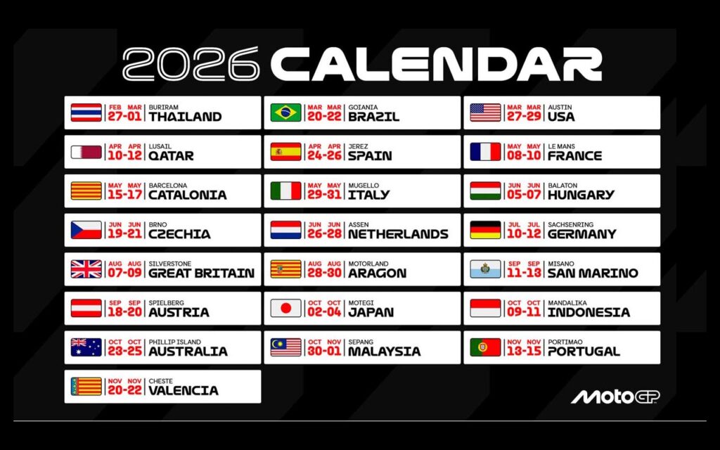 Los últimos días fueron importantes en materia de anuncios, postulaciones y confirmaciones. Así como se supo oficialmente que Termas de Río Hondo no renovaría su contrato para seguir dentro del calendario del Mundial de MotoGP y, al poco tiempo, se anunció la intensión de contar con una fecha en nuestro país en el Autódromo Oscar y Juan Gálvez de Buenos Aires; también desde la empresa promotora de la categoría se dio a conocer el completo calendario de la temporada 2026; un torneo que contará con 22 capítulos y que visitará cuatro continentes, del 27 de febrero al 22 de noviembre.