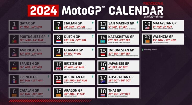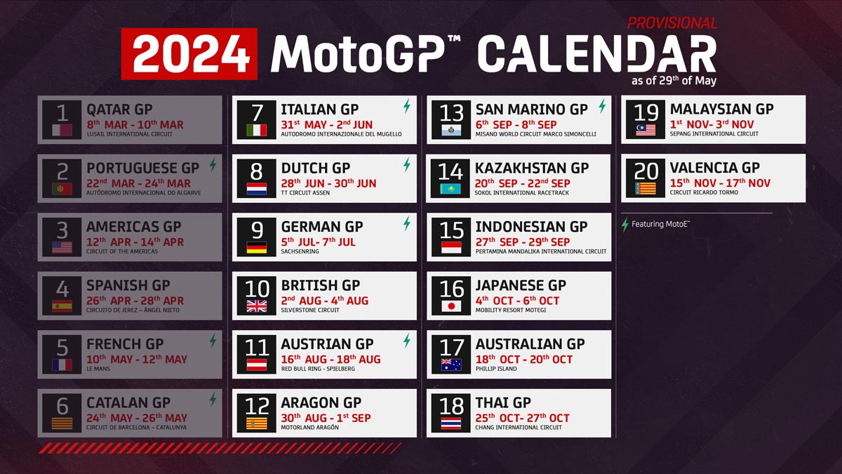 De la misma manera, tanto FIM, como IRTA y Dorna Sports anunciaron una nueva fecha para la realización del Gran Premio 2024 de Kazajstán. Esto es porque las inundaciones en la región donde está situado el Sokol International Racetrack provocaron la postergación del evento desde junio. Por lo tanto, el GP inaugural en aquel país se llevará a cabo del 20 al 22 de septiembre como primera etapa de la gira asiática que tendrá este año el calendario de MotoGP.
