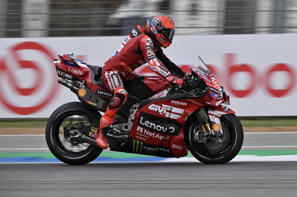 El domingo, Marc Márquez estaba para pelear por una posición de podio pero un golpe en un pianito rompió su llanta trasera y se quedó sin aire (y sin puntos en la Gran Premio). Por su parte, Pecco Bagnaia sumó dos pobres novenos lugares (después de largar desde el puesto 13) y solamente Fabio Di Giannantonio salvó los honores de la marca en el Gran Premio al terminar sexto.