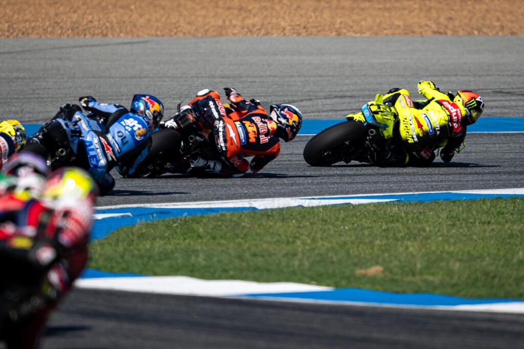 Después de la caída de ‘The Bez’, la pelea la tuvo con Pedro Acosta, en especial en el trámite final de competencia). A un giro para la bandera de cuadros, y luego de un ajustado adelantamiento sobre su Acosta (en donde se produjo un leve toque que sacó de trayectoria al piloto de KTM), Márquez tuvo que devolver la posición a raíz de una penalización impuesta por los comisarios deportivos, por lo que el triunfo quedó para el piloto de la moto #37.