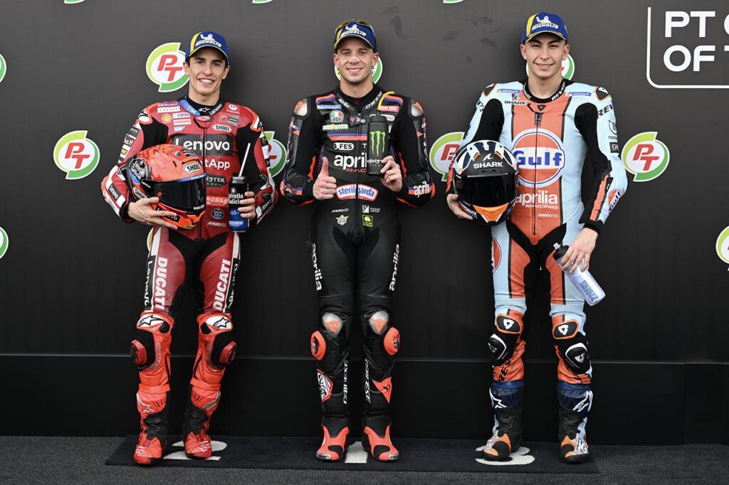Pero la contundencia de Aprilia pudo marcarse con mayor énfasis el sábado, aunque no fue así. Bezzecchi se quedó con la pole a pesar de sufrir una caída en su último intento contrarreloj.