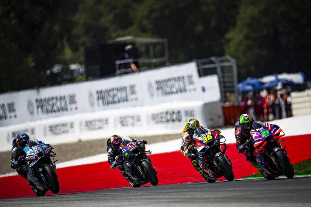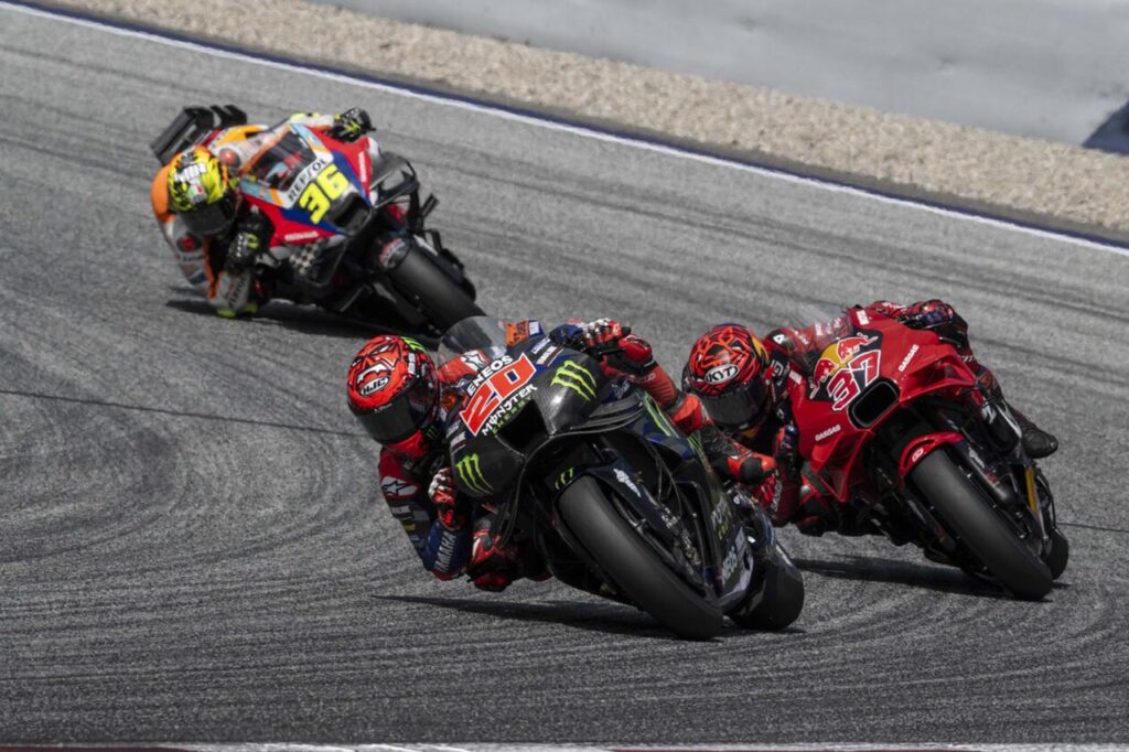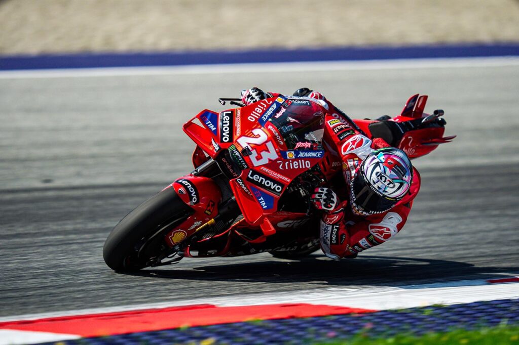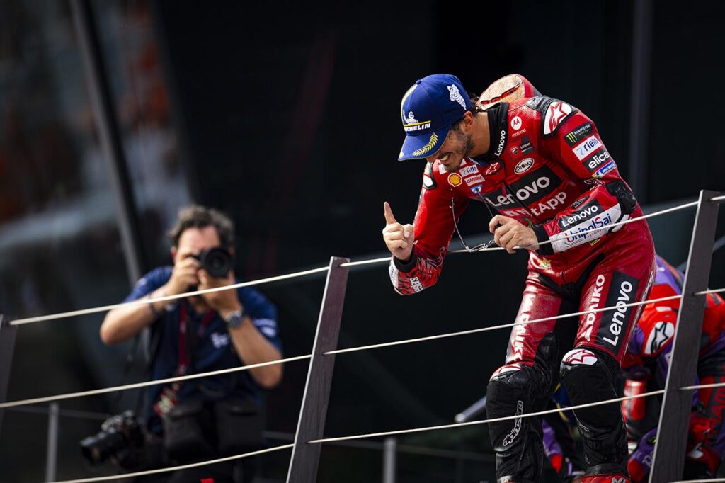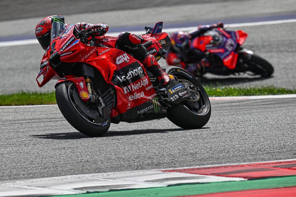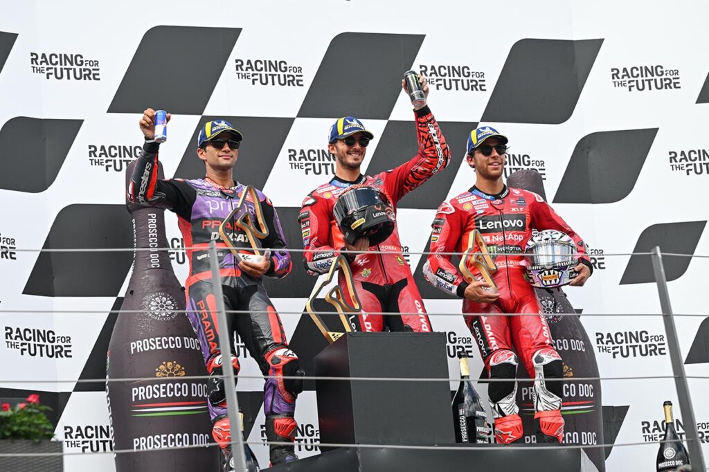 Pecco Bagnaia ganó sin atenuantes en el Red Bull Ring, escoltado por Jorge Martín (Prima Pramac Racing) y Enea Bastianini, su compañero en el Ducati Lenovo Team; mientras que cuarto llegó Marc Márquez (Gresini Racing). Este mismo cuarteto de pilotos de la marca italiana (y en el mismo orden que llegaron en Austria) se encuentran al tope de la clasificación provisional del campeonato.