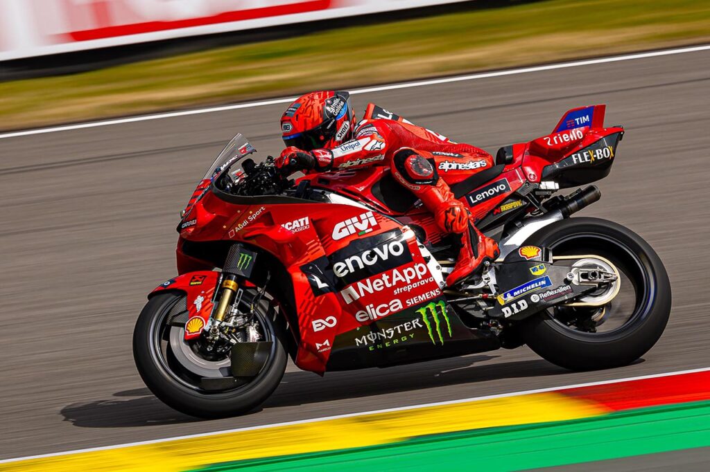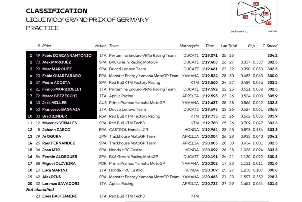 De regreso a Sachsenring, Ducati fue el constructor que marcó el rumbo en la primera jornada, la mayor parte del día con Marc Márquez, pero sobre el final, primero Alex Márquez (que participa luego de fracturarse una mano en Assen) y después con Fabio Di Giannantonio (quien justamente en la semana había anticipado que le estaba faltando ser efectivo en el ‘time-attack’) como los más rápidos.