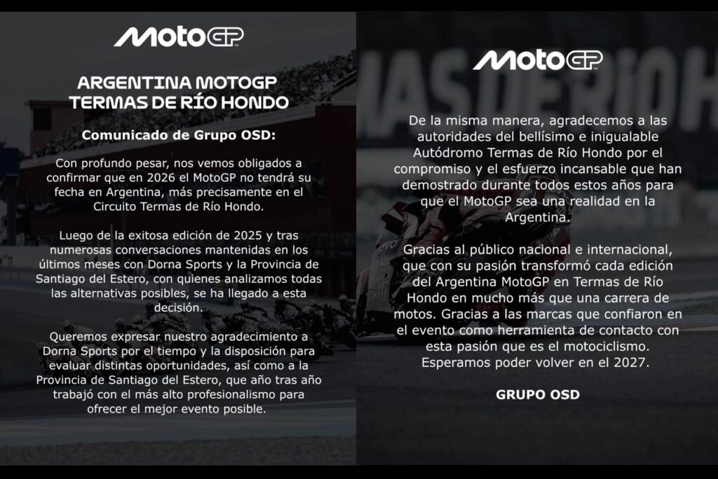 La empresa organizadora de la fecha argentina del Mundial de MotoGP, el Grupo OSD, lanzó un comunicado en sus redes sociales junto a la promotora del campeonato, Dorna Sports, confirmando que no habrá presencia, ni en Termas de Río Hondo, ni en Argentina en la próxima temporada.