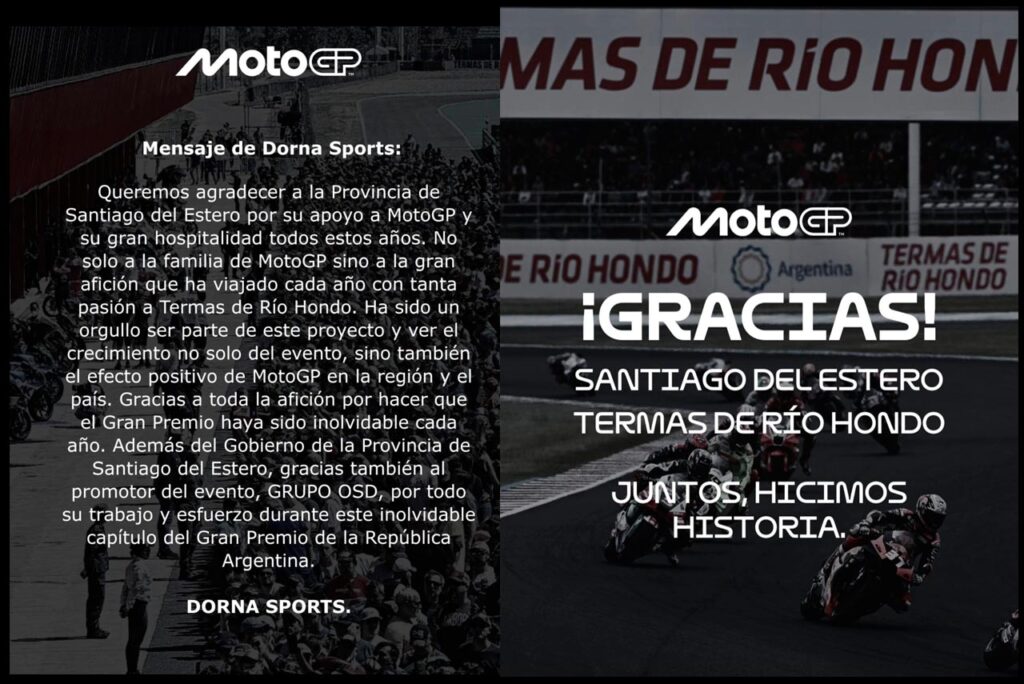 “Queremos expresar nuestro agradecimiento a Dorna Sports por el tiempo y la disposición para evaluar distintas oportunidades, así como a la provincia de Santiago del Estero, que año tras año trabajó con la más alta profesionalidad para ofrecer el mejor evento posible. De la misma manera, agradecemos a las autoridades del bellísimo e inigualable Autódromo Termas de Río Hondo por el compromiso y el esfuerzo incansable que han demostrado durante todos estos años para que MotoGP sea una realidad en Argentina”.