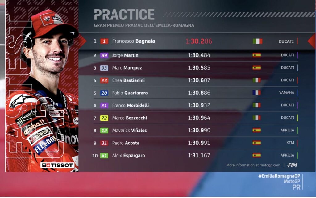 Sin embargo, el más rápido de la jornada del viernes fue Francesco Bagnaia, quien como hace 15 días atrás volvió a batir el récord del circuito para una vuelta y se perfila como un gran candidato para el Gran Premio de Emilia-Romagna.