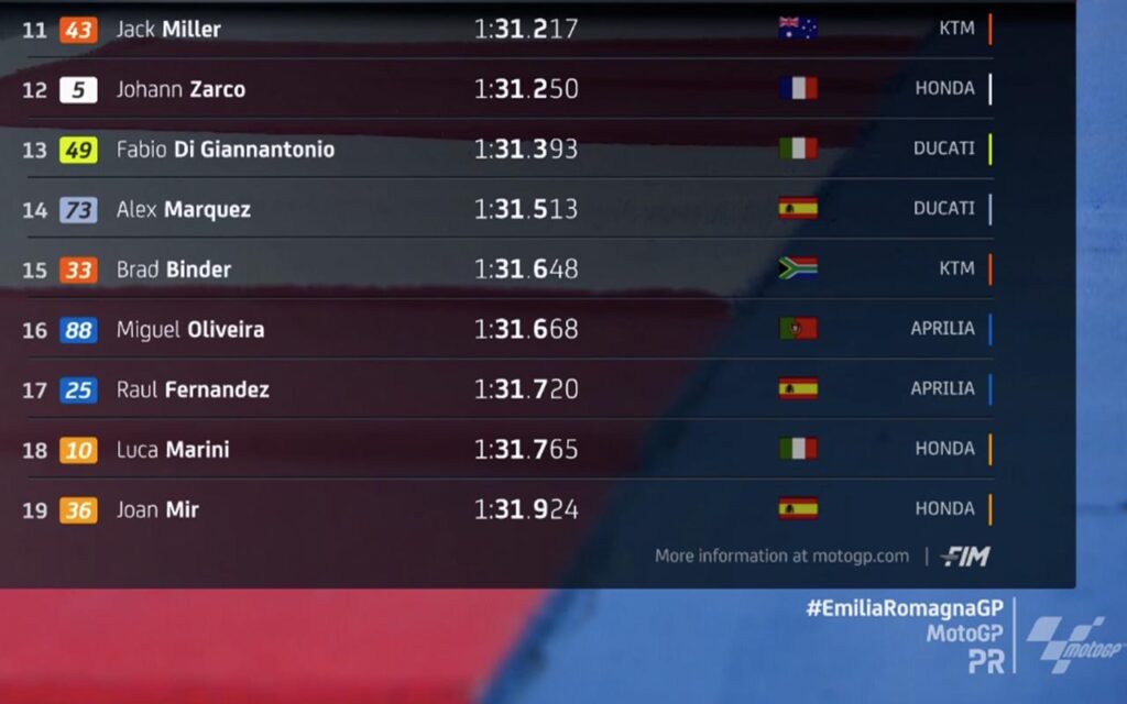 Hasta allí, los 10 que pasaron directo a la Q2 (como puede verse en la tabla); mientras que algunos de los protagonistas de nivel que deberán enfrentarse en la Q1 son Jack Miller (será piloto Pramac Yamaha en 2025), Jonathan Zarco, Fabio Di Giannantonio (se golpeó feo una muñeca en una caída), Alex Márquez y Brad Binder (que aparecen en lo alto de la otra pantalla).