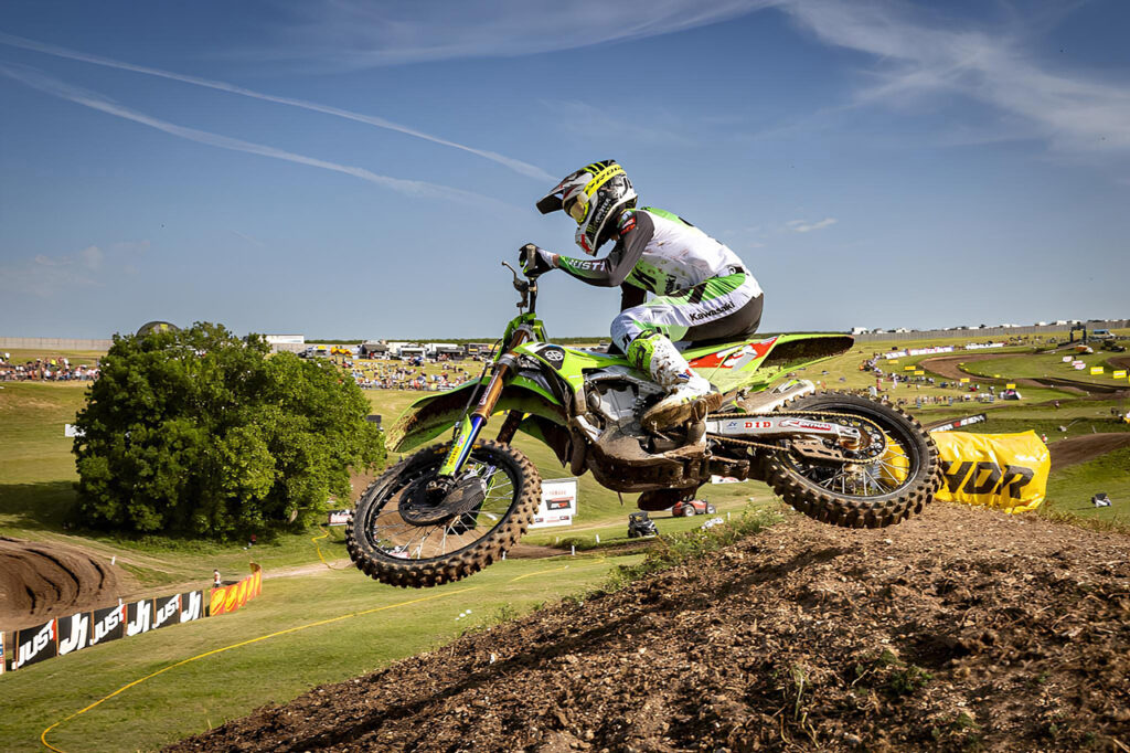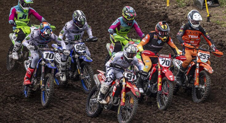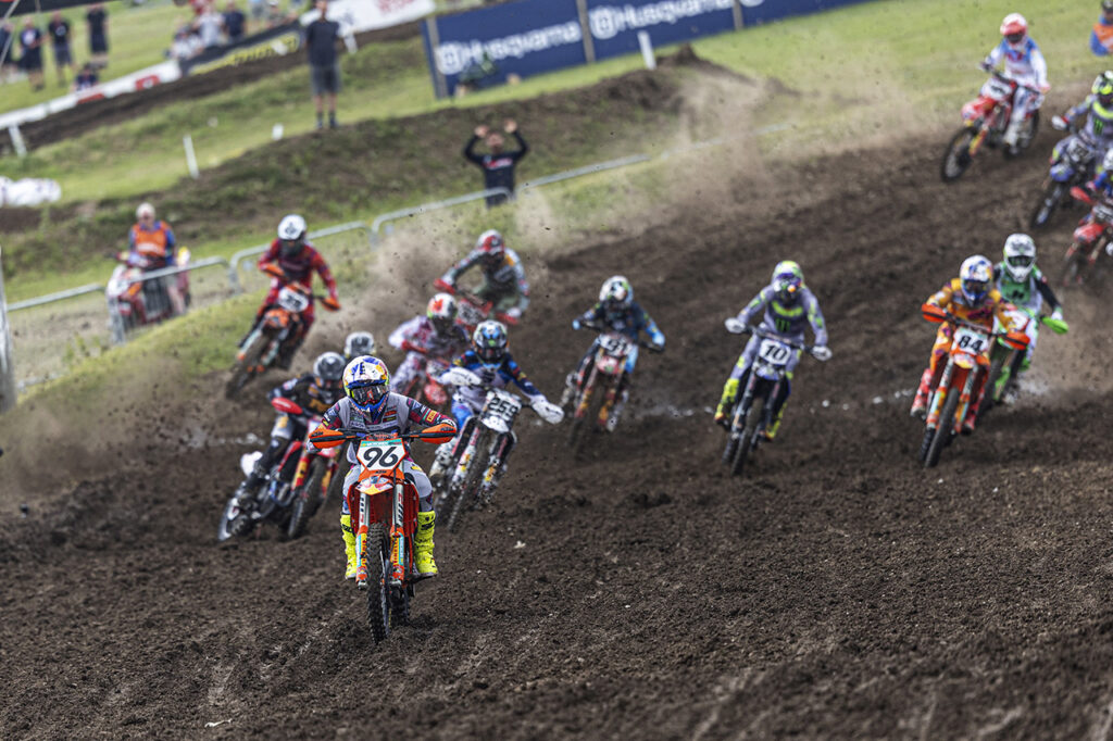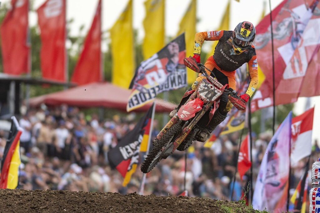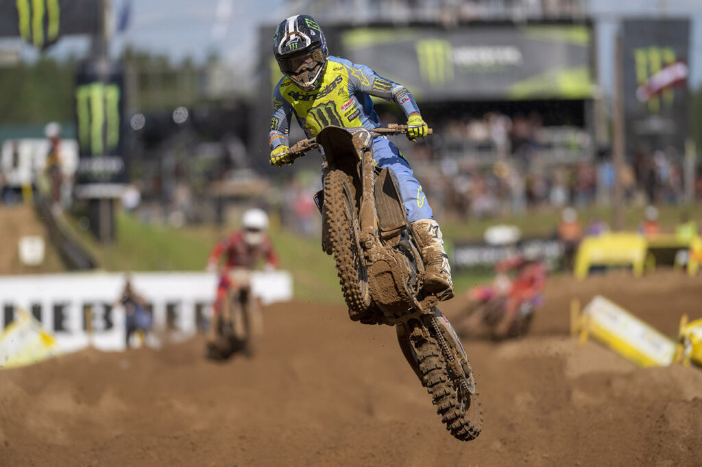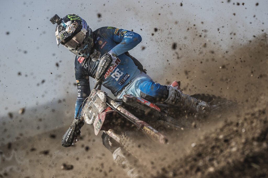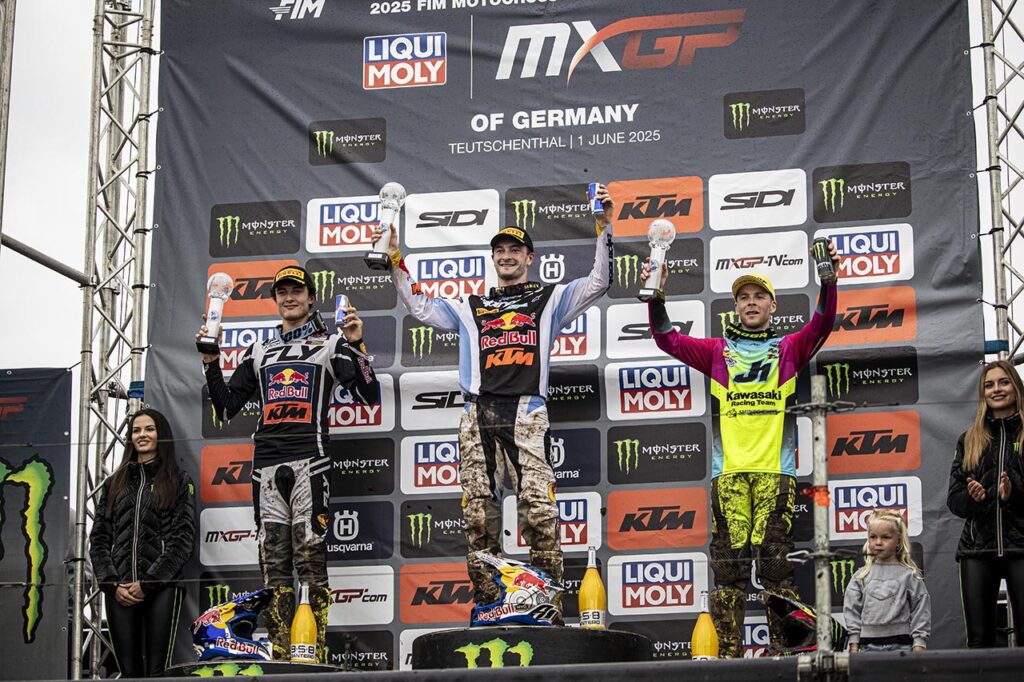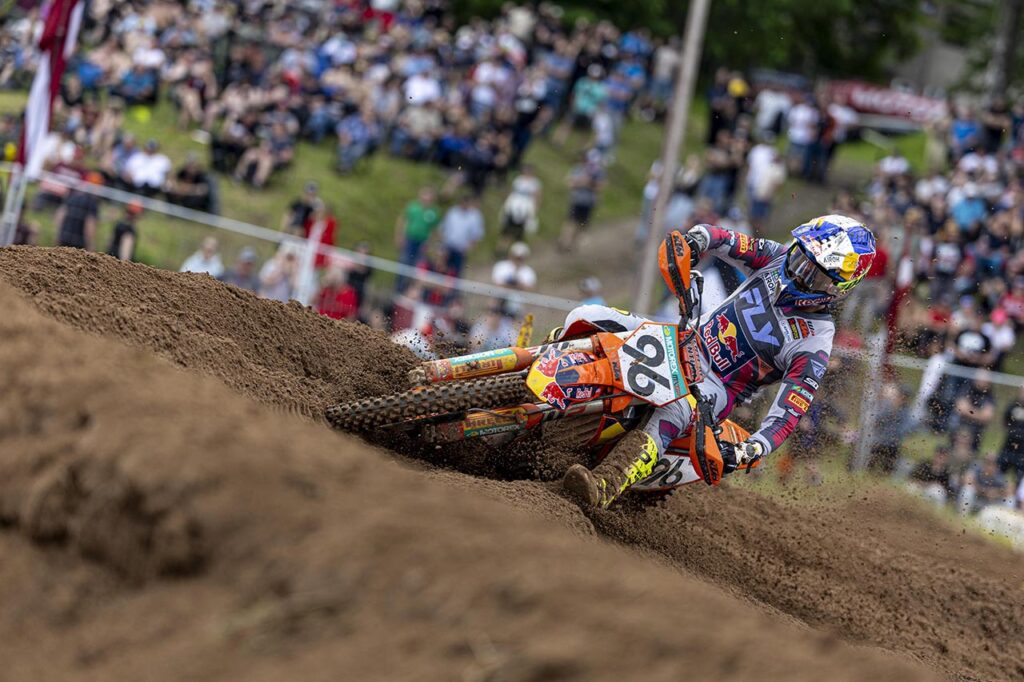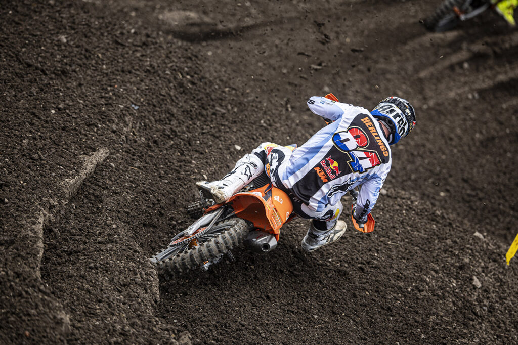 En Alemania, la lluvia se desató para las carreras de la tarde y los verdaderos conocedores de transitar sobre terrenos difíciles salieron favorecidos. Jeffrey Herlings (#84 KTM) sigue recuperando terreno después de perderse las tres primeras fechas por lesión y llegó a su primera victoria de la temporada prevaleciendo por sobre su compañero de marca Lucas Coenen (#96 KTM) y el líder provisional Romain Febvre (#3 Kawasaki).