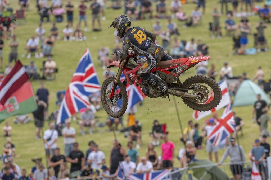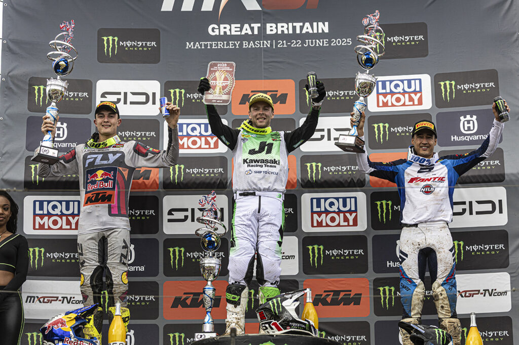 Herlings terminó quinto en Gran Bretaña y el podio lo coparon Romain Febvre (#3 Kawasaki), Lucas Coenen (#96 KTM) y Glenn Coldenhoff (#259 Fantic) que de a apoco está llevando a la marca italiana a los primeros planos (y ya ganó un parcial).