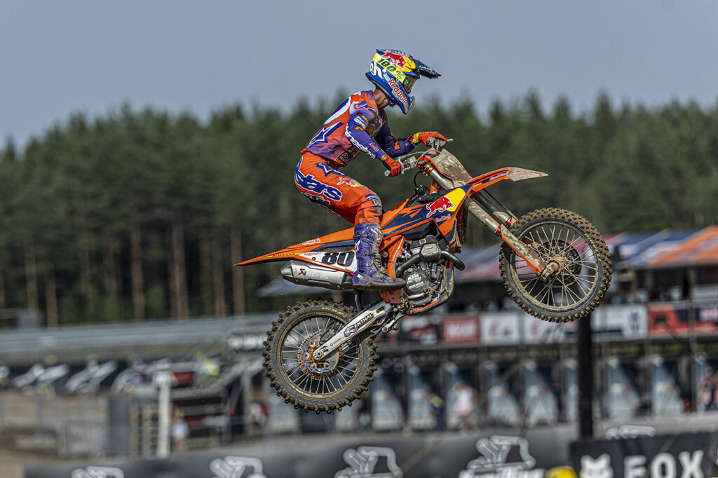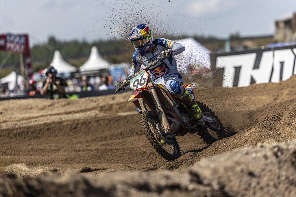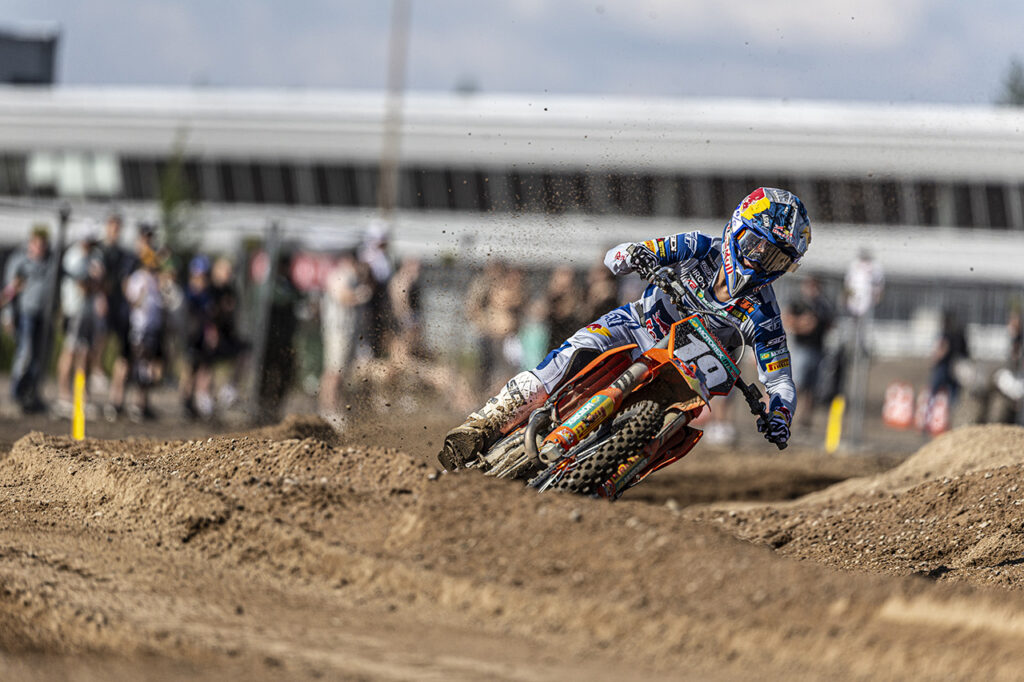 Después de cinco segundos puestos consecutivos, Lucas Coenen (#96) consiguió su tercera victoria de la temporada con la KTM del Red Bull Factory Racing y lo hizo con un fin de semana perfecto, ya que prevaleció en la carrera clasificatoria del sábado y las dos mangas del domingo. De esta manera, acortó distancias en su camino hacia la placa roja.