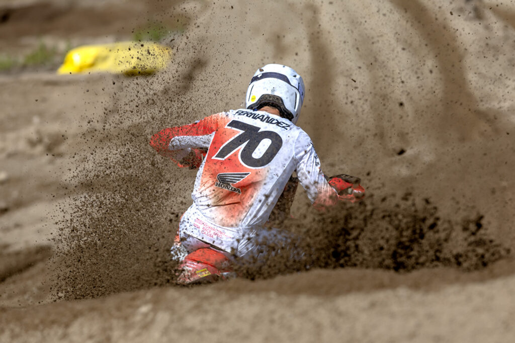 En lo que respecta a Rubén Fernández (#70), el fin de semana fue de altas y bajas. El único representante del equipo HRC Honda en la clase mayor mientras se espera la recuperación definitiva de Tim Gajser (ya estuvo girando sobre la moto de carreras), estaba esperanzado por su cuarto puesto en la carrera del sábado, se mantuvo en el Top5 en la Moto1 hasta poco del final (cuando perdió una posición), pero todo se derrumbó en la segunda competencia, al recibir un golpe apenas superada la largada, retrotraer posiciones, recuperar hasta los diez primeros y luego abandonar ya que su moto no aguantó la exigencia tras el accidente.