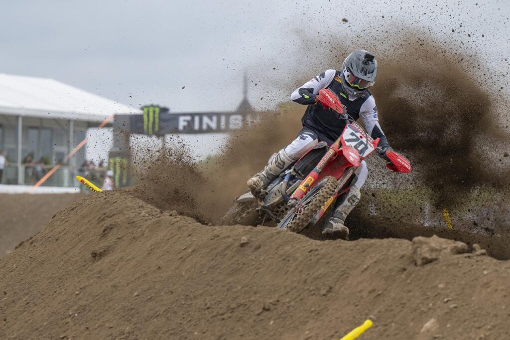 Y en ese momento, con una temperatura ambiente que excedía los 35 grados, la acción en pista tuvo el peor comienzo posible. El piloto de la Honda CRF450R con el #243 se involucró en un accidente en la segunda curva, quedó último y comenzó a recuperar hasta ingresar al lote del Top15.