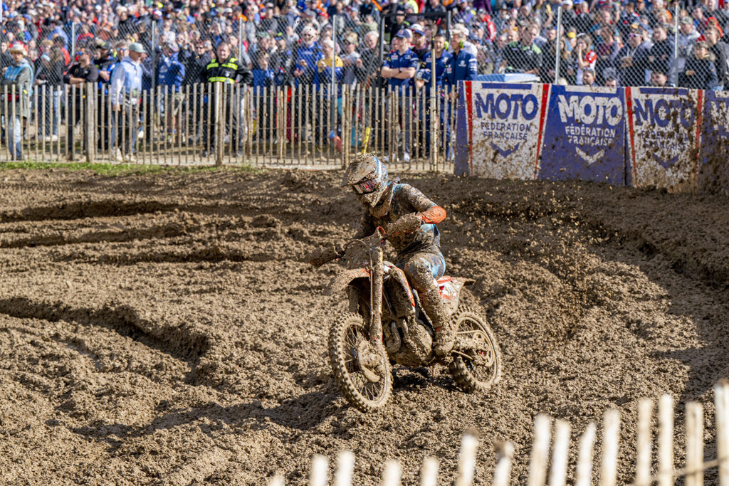 En la Manga1, con un piso más compacto pero igualmente exigente, Gajser sacó a relucir todo el potencial de la Honda CRF450R para ganar sin atenuantes por sobre Jorge Prado (GasGas) y Romain Febvre (Kawasaki). Antes que se inicie la segunda parte del espectáculo, una nueva tormenta descargó mucha agua sobre el circuito, haciendo que las condiciones fueran semejantes a las del día sábado. Gajser penó mucho más para avanzar posiciones después de una mala largada (había una sola huella que imposibilitaba los sobrepasos) y, luego de terminar sexto en pista, una resolución de los comisarios deportivos sobre otros pilotos que no habían respetado banderas amarillas, hizo que el eslovaco fuera reubicado en la cuarta colocación y, con esto, quedarse con la general del GP de Francia a través de su 1-4 en los resultados.