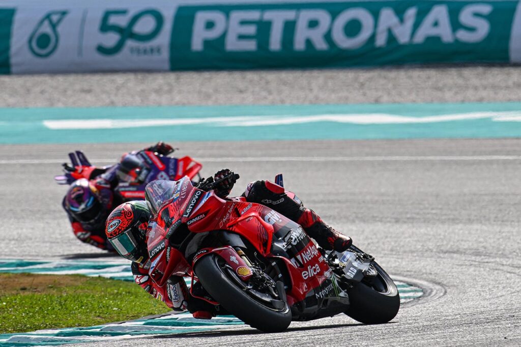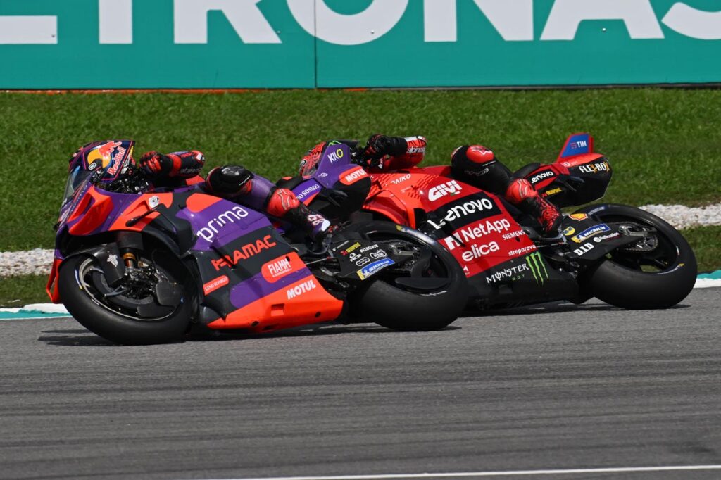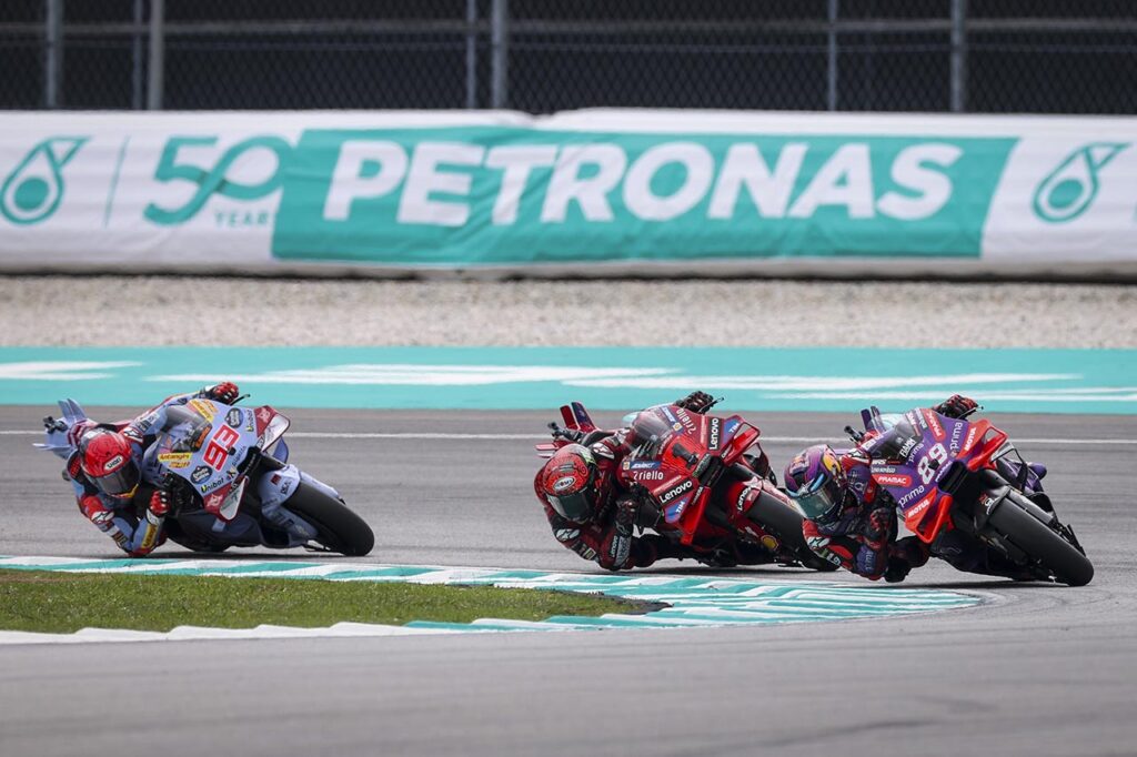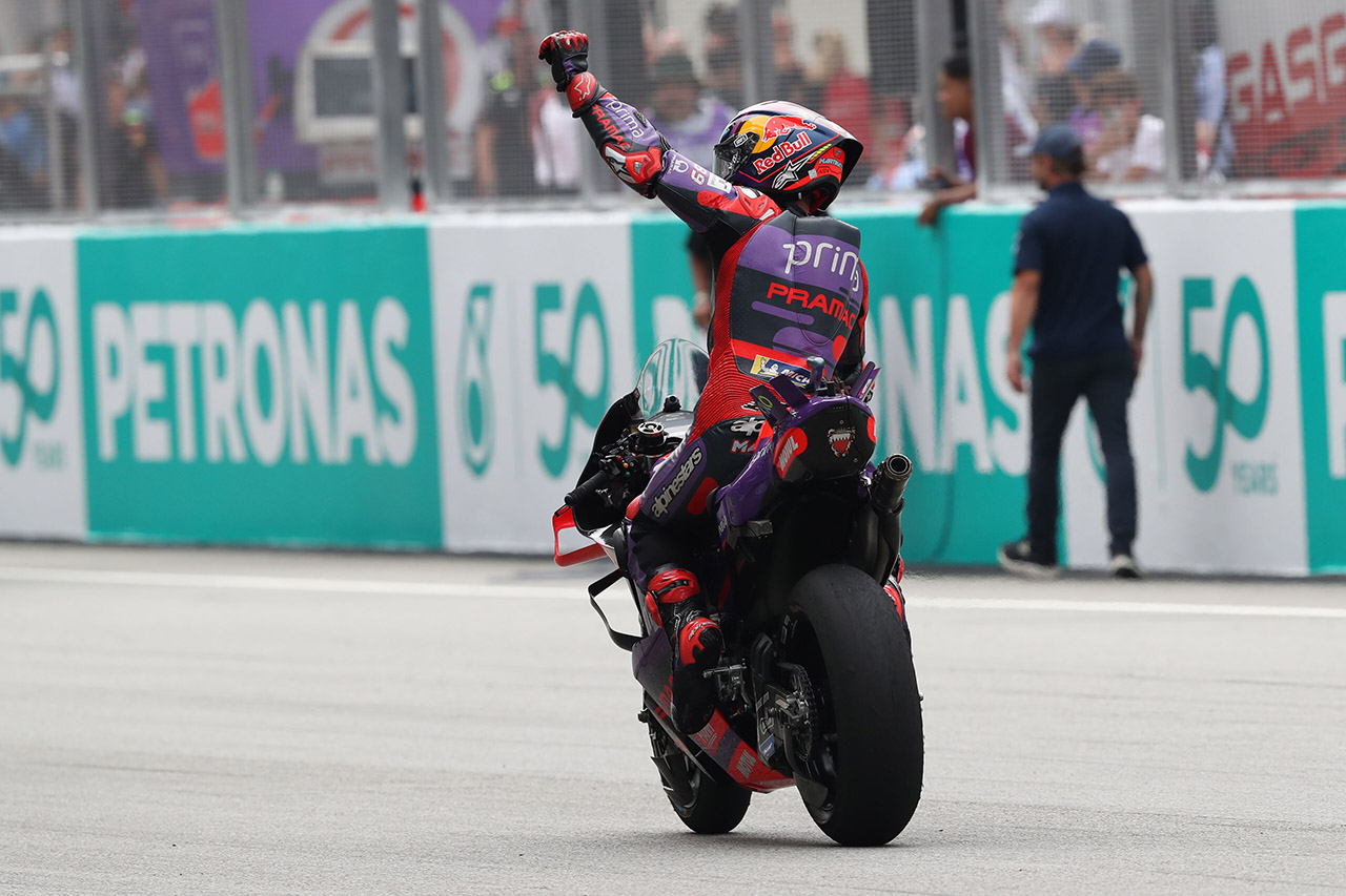Después de la caída de Pecco en la tercera vuelta de la Sprint Race del sábado en Sepang, Jorge Martín afrontó el Gran Premio del domingo con una ventaja de 29 puntos en la tabla provisional. El madrileño de la escuadra satélite sabía que LO ÚNICO que tenía que hacer era no meterse en dificultades. Sin embargo, tozudo y con una autoestima casi suicida, le peleó cada centímetro de la pista al Campeón Bagnaia, quien a su vez LO ÚNICO que tenía que hacer era ganar la carrera, sin medias tintas.