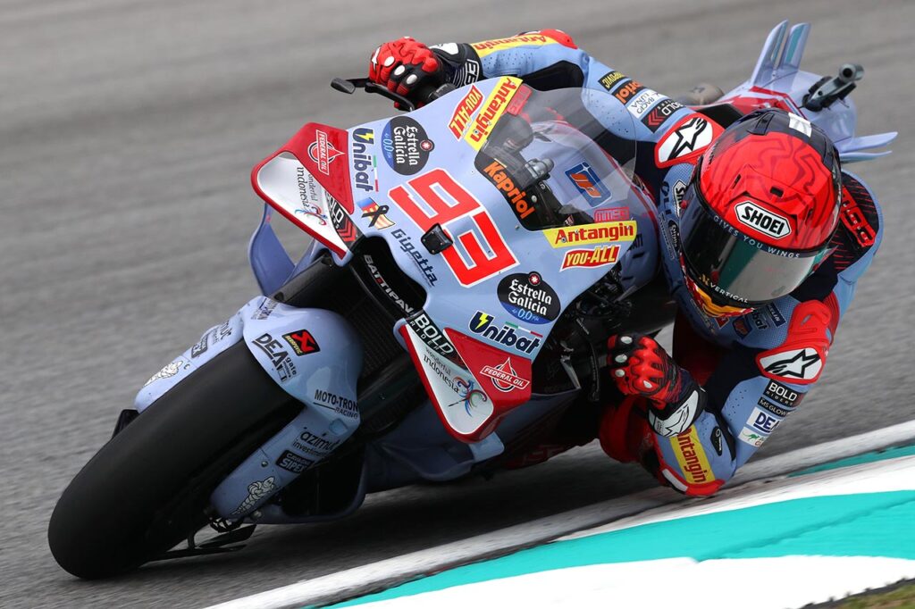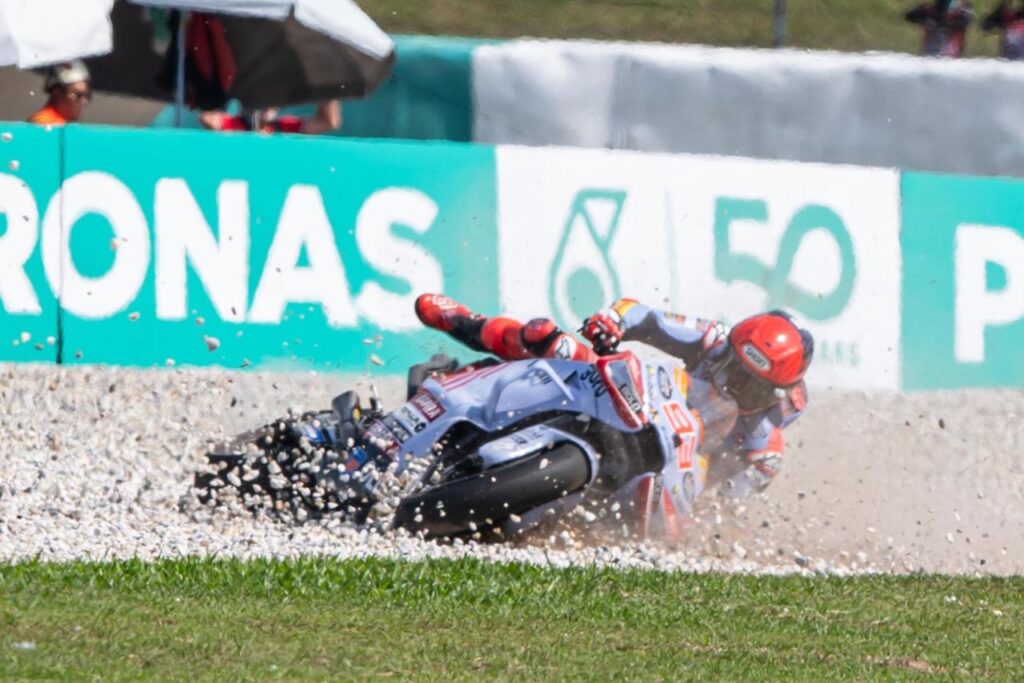 El único que intentó algún acercamiento fue Marc Márquez, pero el desempeño de la Desmosedici GP23 nada tiene que ver con la de su evolución 2024 y el múltiple campeón español tampoco es mago. Cuando el delantero llegó al límite (empujado por la potencia que transmite el Michelin trasero), se bloqueó y fue caída en la vuelta 7, al ingreso a la recta de meta.