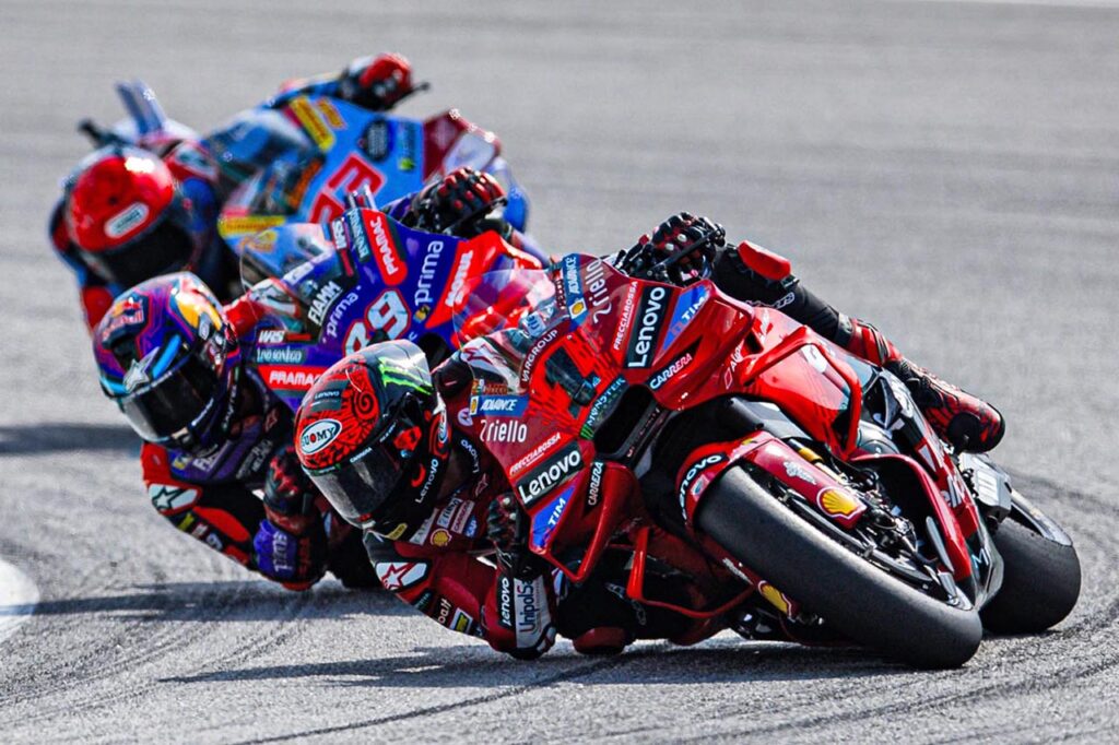 Al observar con más calma la reiteración de ese momento de gloria para el deporte de las dos ruedas, Pecco y Jorge se superaron no menos de 15 veces en el transcurso de tres vueltas frenéticas, escapándose a su vez de los rivales que le perseguían (Marc Márquez incluido), quienes no tuvieron ni chances de terciar en tremenda lucha.