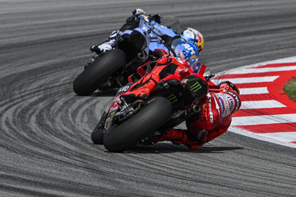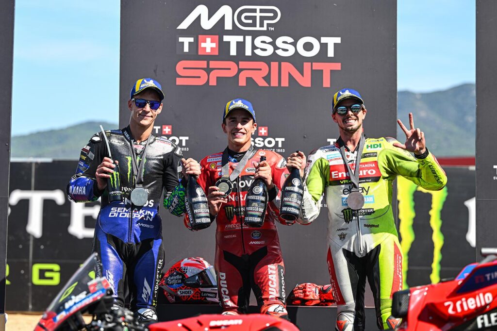 “Ya en mi primera salida con la GP24 pude ser muy rápido, llevar la moto como yo quería y disfrutarla a pleno”, explicó el ganador. “El año pasado tuve dificultades con la GP23, pero la experiencia que adquirí con esa moto me está ayudando ahora. En un año difícil se aprende el doble de lo que se aprende en un buen año”, agregó antes de dejar en claro que: “en el Gran Premio intenté gestionar los neumáticos y mi estrategia fue volver a presionar, a siete, ocho o nueve vueltas del final, cuando sabía que él iba a atacar. Fue una situación muy especial porque no es fácil controlar a Marc”.