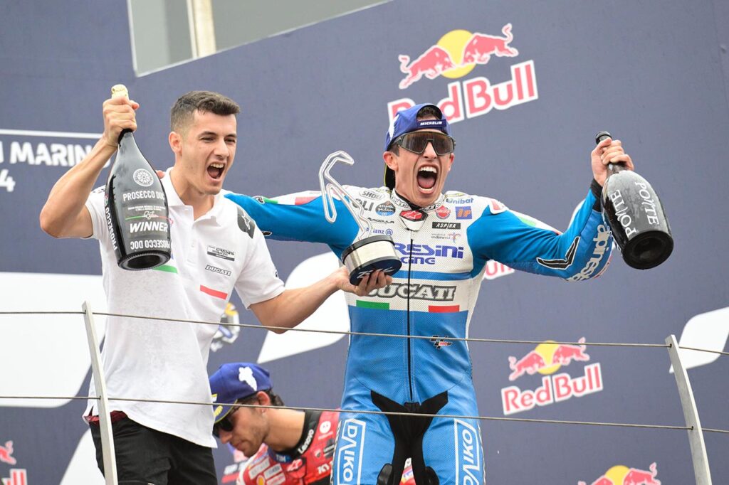 Si se sabe que Márquez es uno de los pocos que sabe llegar al límite sobre condiciones dudosas, pero que también acepta cada desafío y no le importa tomar riesgos, jugársela en Misano (especialmente después de la motivación que le generó ganar en Aragón), y ‘sin nada que perder’, se entiende cómo pasó de estar sexto a quedar primero en menos de una vuelta, sin encontrar oposición de sus rivales (y muchos menos de un conservador Bagnaia, dolorido por la caída que sufrió la semana pasada).