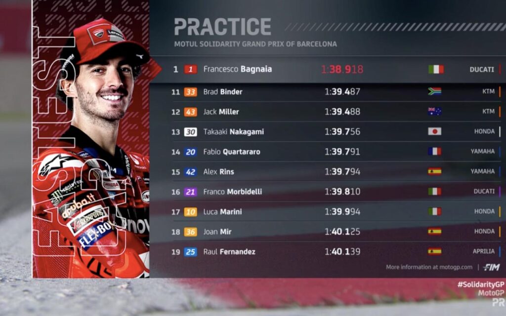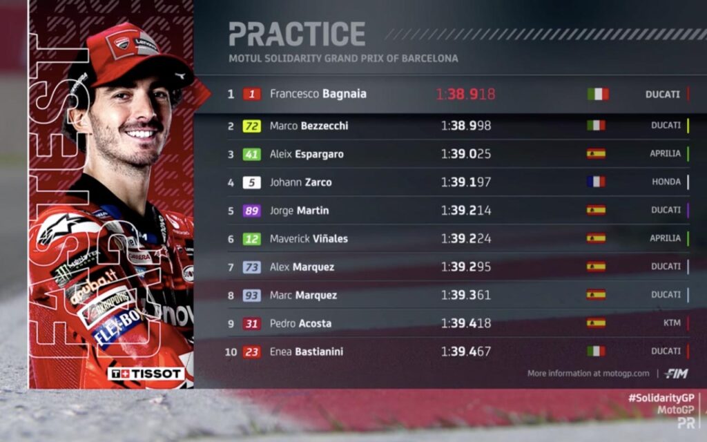 La primera jornada del episodio final de #TheRematch en el Gran Premio Solidario Motul de Barcelona ya acabó en los relojes y quedó para el cazador: Francesco Bagnaia (Ducati Lenovo Team).