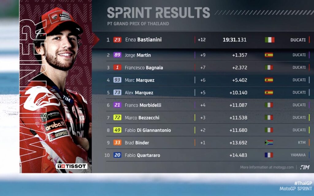 El final, cómodo en la punta, no tanto en los restantes escalones del podio, significó un nuevo hito para Ducati.