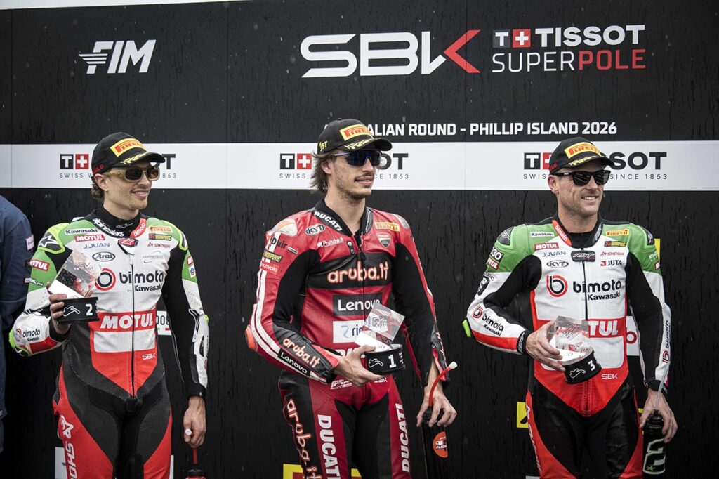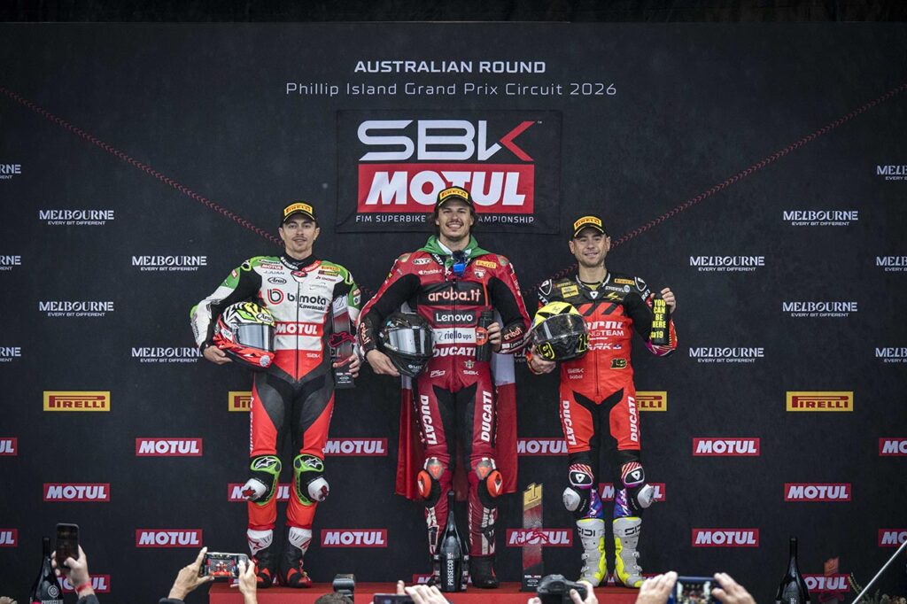 Junto a Bulega en el podio de coronación, su ex compañero en el Aruba.it Racing-Ducati, Álvaro Bautista, consiguió a bordo de una unidad del Barni Racing Team un buen resultado en el arranque del campeonato; mientras que en medio, como cuña, el también italiano Axel Bassani logró un gran resultado para Bimota-Kawasaki con su segundo puesto y resultó ser el único en estar más cerca de las Panigale V4R en esta apertura del campeonato.