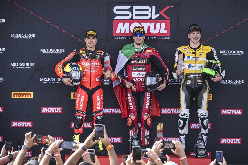 Así, el piloto del equipo Aruba.it Racing-Ducati calcó el ‘triplete’ obtenido el año pasado en Australia y, al lograr su éxito número 23, se convirtió en el italiano más ganador en la historia de WorldSBK, dejando atrás a Marco Melandri con 22 éxitos.